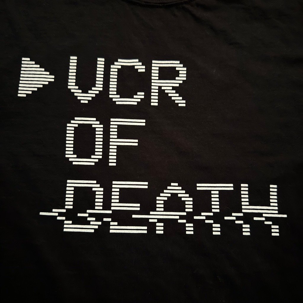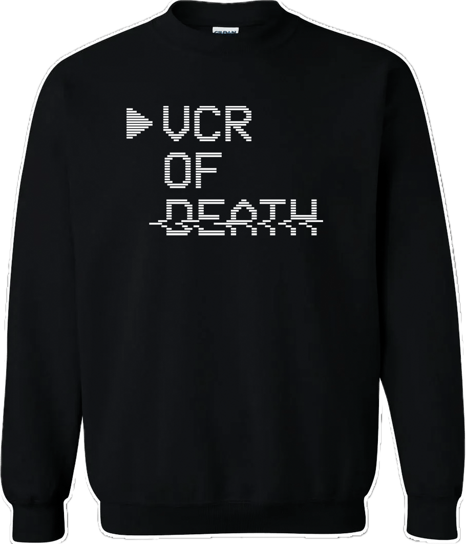 The artwork is dead simple. Just the VCR of Death logo in white on a black Gildan heavy blend sweatshirt. No frills, no flourishes, just a badge that lets everyone in the room know you've seen Hard Ticket to Hawaii AND Picasso Trigger.